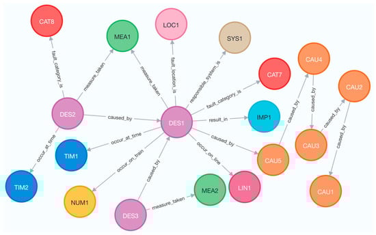 Table 3 demonstrates the relationships among entities, using the examples of knowledge entities provided in Table 2. For instance, the fault phenomenon recorded in Fault Report R20180001 triggered the fault phenomena documented in Fault Reports R20180002 and R20180003. Additionally, the fault phenomenon in Fault Report R20180001 itself was caused by a series of interconnected reasons. This indicates that, in actual railway operations, there may be chain reactions between various fault phenomena and their causes. These relationships are maintained in the Neo4j (version 5.26.0) graph database, providing a graphical depiction of the CROEFKG, illustrated in Figure 2. As demonstrated in Figure 2, these relationships in the CROEFKG highlight the complex interdependencies inherent in fault management within railway systems. This underscores the necessity of integrating and analyzing comprehensive data to support effective operational management and improve fault resolution strategies.