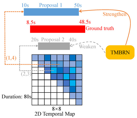 Based on this, the IoU of the i-th moment candidate in the temporal map can be readily calculated and denoted as . Meanwhile, we can also obtain the label of offsets between every moment candidate in the temporal map and ground truth, which can be denoted as . In the process of TMBRN training, we utilize a scaled IoU as a label to replace the traditional hard binary label [25], which can be calculated by the following formula: