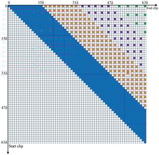 A demonstration of the multi-step sampling on the 2D temporal map. In the Figure, the grids marked blue, orange, purple, and green represent moment proposals sampled with four different interval segments, respectively. The blue area denotes the moment candidates whose periods range from 1 to 16 clips, where we sampled all moment proposals. The orange region represents the moment candidates whose lengths range from 17 to 32 clips, sampled with a two-clip stride on both the horizontal and vertical axis in the 2D coordinate system. The purple area stands for the moment candidates whose durations range from 33 to 48 clips, sampled with a three-clip stride. Similarly, the green region indicates moment candidates whose lengths range from 49 to 64 clips, sampled with a four-clip stride.