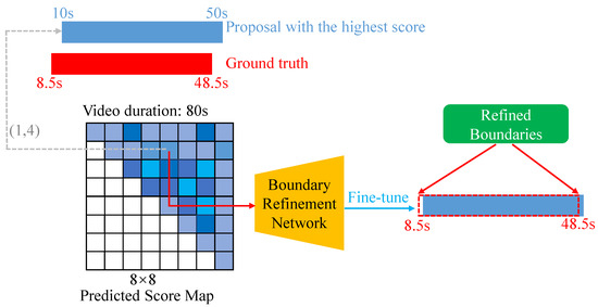 Finally, we obtained a confidence score map and an offsets map based on the temporal feature map. Here, the offsets predicted by the boundary refinement network refer to the gap between the two boundaries of each moment candidate in the temporal map and the ground truth. Then, we collect the confidence scores and offsets of all valid moment candidates in the temporal map denoted as , , respectively, where C stands for the number of valid moment candidates. Therefore, the one with the highest confidence score is regarded as the correct moment candidate, and the final prediction result is the sum of the original timestamp of this candidate and its corresponding predicted offsets.