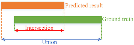 As shown in Figure 1, the start and end boundaries of each moment candidate in the temporal feature map can be expressed as , where i and j stand for the indexes of start and end clips in the temporal map, respectively. Moreover, indicates a unit of time in the temporal map, which refers to the length of each grid (converted to absolute time). Specifically, it can be calculated with , where D stands for the duration of the entire video. Based on the above description, we can calculate the IoU (Intersection of Union) between each moment candidate and ground truth in the temporal map. As shown in Figure 6, the IoU can be computed by the following formula: