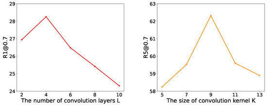 Figure 7 shows the impact of the number of convolution layers and the size of the convolution kernel on localization performance in the boundary refinement network. When studying the number of convolution layers, we first empirically fixed the convolution kernel size , and we can see that the best performance occurs when from the left chart. However, the performance declines when the number of convolution layers increases continuously. This phenomenon can be attributed to the potential loss of crucially original features when stacking excessive convolutional layers. Similarly, we fixed the number of convolution layers , and we can intuitively observe from the right subgraph that the localization precision reaches the maximum when . When , the larger the convolution kernel, the better the performance, which means that a small convolution kernel cannot effectively aggregate the context information of adjacent moment candidates. When , as the size of the convolution kernel increases, the performance begins to decline. This may be because if the convolution kernel is too large, information fusion is not smooth, degrading the model’s localization performance. Therefore, the more convolution layers and the larger convolution kernel sizes do not denote better performance. Moreover, these two experimental results convincingly verify that the values of K and L in this paper are set reasonably.