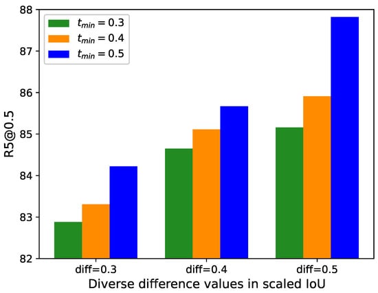 Figure 8 shows the impact of different threshold settings of the scaled IoU. The horizontal axis represents the difference value between the threshold and the threshold , while the three bars in each group denote the , respectively. As can be seen from the figure, the smaller the difference value between the upper and lower thresholds, the lower the overall localization accuracy of the model. This may be because when all the IoU values are converted into a smaller interval, the diversity of the original IoU values is lost, which conversely makes the training effect of alignment loss worse. In addition, the larger the , the better the model performance. We think the potential reason is that the scaled IoU solution directly regards moment proposals with a small IoU value as invalid moment candidates, which can reduce the complexity of the prediction.