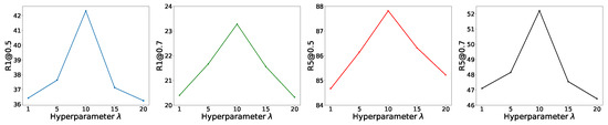 The ablation study of the hyperparameter on the Charades-STA dataset. From left to right, each subgraph represents the result of R1@0.5, R1@0.7, R5@0.5, and R5@0.7, respectively.