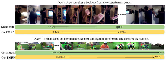 Figure 10 demonstrates some visualized results, which can intuitively verify the reliability of our devised TMBRN. As shown in the top subfigure, for the given query, “A person takes a book out from the entertainment center”, the TMBRN generates a video segment whose IoU is about 91%. However, this is the result of the Charades-STA dataset, in which the duration of the video is relatively shorter. As a comparison, in the bottom subfigure, we also show the visualized results on the ActivityNet Captions dataset in which the video has a 2 min average duration. For the more complex query, “The man takes out the car, and other men start fighting for the car, and the three are riding it”, which contains three different actions, the TMBRN also outputs a video segment with 90% localization precision. This further confirms that our proposed TMBRN model has strong stability and high reliability.
