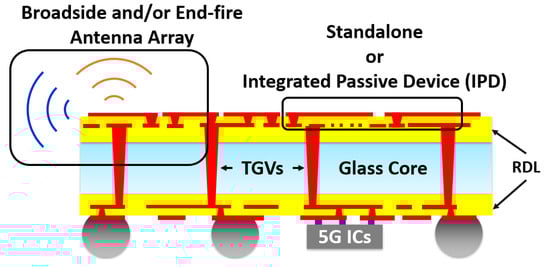 Increased path loss with higher operating frequencies such as 5G mm wave bands requires the use of directed communication to provide Gb/s data rates with high fidelity and low latency. Antenna–in–package (AiP) architecture is almost universally sought for all 5G applications such as user equipment (UE), customer premises equipment (CPE) and base–stations [,,,]. The research and development in this area has fueled many breakthroughs in related primary and auxiliary technologies, particularly for 5G NR mm wave applications. Specifically, integrating phased arrays in packages poses challenges such as increased complexity and reduced thermo–mechanical reliability, leading to the co–design of passives, ICs and antenna elements []. Understanding the system–level specifications and translating them to IC–, package– and component–level requirements can aid in achieving a faster time to market []. A cross-section of a modern 5G module with broadband and/or an end–fire antennas is shown in Figure 1. Heterogeneously integrated active and passive components along with high–density layers for digital routing and low–loss, seamless interconnects are key features of this glass–substrate–based module.