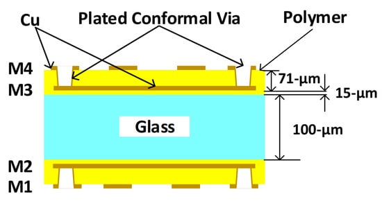 A four–metal layer material stackup is selected for this demonstration, as shown in Figure 3. The core material is a 150 × 150 mm2, 100 m thick glass substrate (EN–A1) panel from Asahi Glass Company, Tokyo, Japan (AGC) and it has dielectric permittivity () of 5.4 and a loss tangent (tan) of 0.005 at 10 GHz. The polymer dielectric is a low–loss epoxy film from Taiyo Ink. Mfg. Co., Saitama, Japan (ZaristoTM) with 15 m and 71 m thickness. It has of 3.3 and tan of 0.0025 at 10 GHz. The 15 m thick Taiyo Zaristo is laminated onto a bare glass panel on which metal layers M2 and M3 are patterned, followed by lamination of 71 m Zaristo onto which M1 and M4 are patterned. M2 and M3 act as ground planes to microstrip integrated passive components on M1 and M4. The stackup is double–sided to avoid panel warpage during the fabrication process. The thickness of copper is set to 8 m, which is sufficiently higher than five times the skin depth at an operating frequency of 40 GHz. The total thickness of this stackup is 202 m.