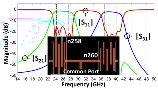 Since the 28 and 39 GHz 5G NR bands are separated by a frequency range of 29.5–37 GHz (not including edge frequencies), the diplexer structures for these bands are non–contiguous and can be designed using the aforementioned doubly terminated filters. A T–junction with special properties can be designed to connect two doubly terminated filters in such a way that they do not load each other and effectively appear “open” in the stopband of the other filter []. This configuration results in a diplexer. Using the doubly terminated filters designed for this demonstration, hairpin, interdigital and edge–coupled diplexers are designed. The simulated response of a diplexer based on interdigital filters for bands n258 and n260 and its layout are shown in Figure 4.
