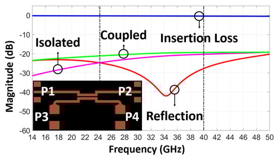 Simulation results of a coupled–line coupler covering 24.25–40 GHz along with its layout.