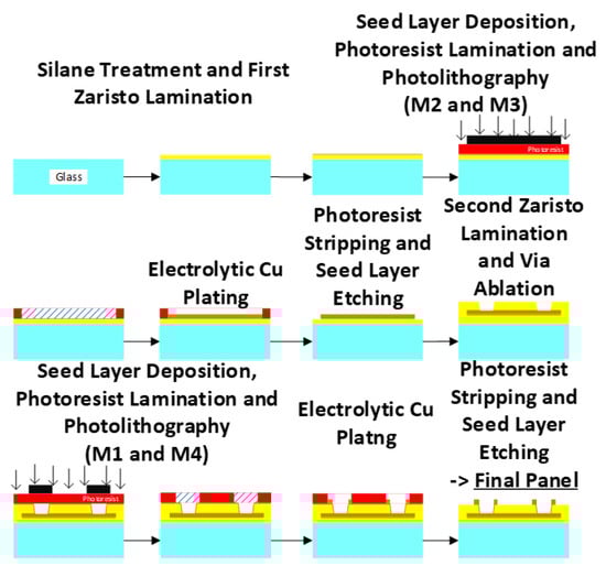 - Lu, H.; Furuya, R.; Sawyer, B.M.D.; Nair, C.; Liu, F.; Sundaram, V.; Tummala, R.R. Design, Modeling, Fabrication and Characterization of 2–5-μm Redistribution Layer Traces by Advanced Semiadditive Processes on Low-Cost Panel-Based Glass Interposers. IEEE Trans. Components, Packag. Manuf. Technol. 2016, 6, 959–967. [Google Scholar] [CrossRef]