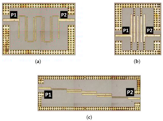Fabricated filter coupons: (a) hairpin for band n257, (b) interdigital for band n258 and (c) edge–coupled for band n260.