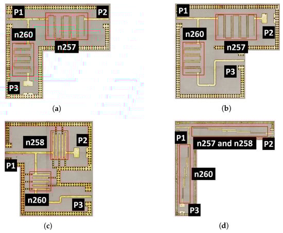 Fabricated diplexer variants: (a) hairpin for bansd n257 and n260 (S21 measurement only), (b) hairpin for bands n257 and n260 (S31 measurement only), (c) interdigital for bands n258 and n260 (S31 measurement only) and (d) edge–coupled for combined bands n257 and n258, and n260 (S21 measurement only).