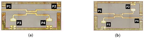 There are two fundamental limitations of the available measurement setup which influence the design stage. The first one is the truncation of measured data at the highest frequency of VNA (40 GHz). The second limitation, which results in an extensive and elaborate design stage, is the number of VNA ports (limited to two). Since diplexers, couplers and their integrated versions are multi–port networks, several versions of the same structure need to be designed with the remaining ports terminated using broadband terminators. In this way, a three–port network such as a diplexer requires three design variants to obtain all six s–parameters, as governed by a commonly known formula of combinations. The combination of a diplexer and a coupler leads to a five–port network which requires ten design variants for complete characterization. To maintain practicality in measurements, a few variations are designed to obtain key s–parameters, such as S21 and S42, for the combined diplexer and coupler, as shown in Figure 10. High–frequency chip resistors with a 0402 (1005 metric) footprint are chosen as the broadband terminators []. Some of the soldered resistors on the fabricated multi–port structures, such as diplexers, couplers and their integrated versions, are shown in Figure 11.