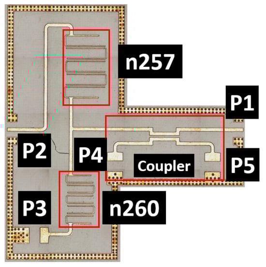Fabricated variant of integrated passive component block: hairpin diplexer for bands n257 and n260 combined with coupler (for S21 measurement only).