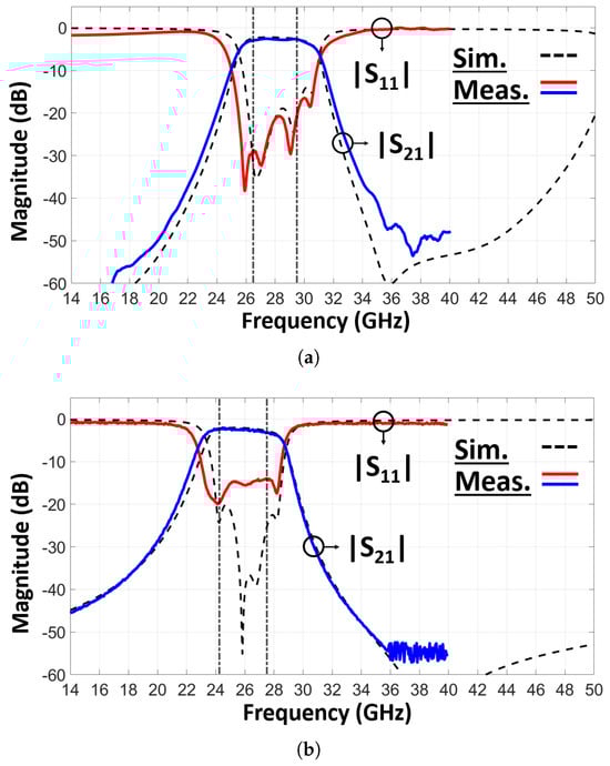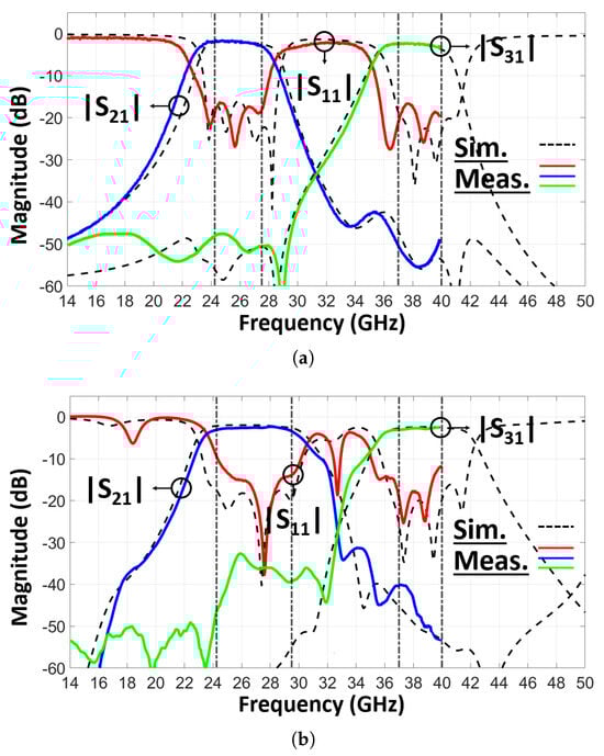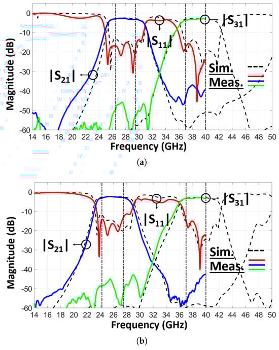 Comparison of simulated and measured results of diplexers: (a) interdigital for bands n258 and n260, and (b) edge–coupled for combined bands n257 and n258, and n260.