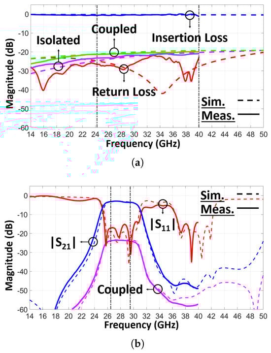 A comparison of simulated and measured results of the coupled–line coupler covering the 24.25–40 GHz frequency range is shown in Figure 15a. The maximum measured insertion loss of the coupler in the entire frequency range is 0.4 dB, the return loss is better than 20 dB and the coupling is about 20 dB with small variation.