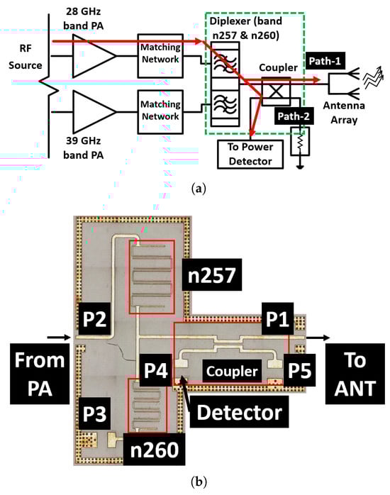 In this section, a system–level performance analysis for the integrated passive component block is presented. The purpose of these co–simulations is to provide insights into the system performance of components in an RF chain and to provide accuracy in the link budget and operation range analyses []. The integrated passive component block shown in Figure 10 is selected for these simulations as two-port measurements are performed to characterize two critical paths:– Path–1: RF Source –> PA –> Diplexer (band n257) –> Coupler (Thru) –> Antenna Input; Path-2: RF Source –> PA -> Diplexer (band n257) –> Coupler (Coupled) –> Power Detector. These paths are highlighted in Figure 16a, and they can be corroborated with the integrated passive component block as shown in Figure 16b. The following system–level simulations are performed to quantify the distortion caused by this block: