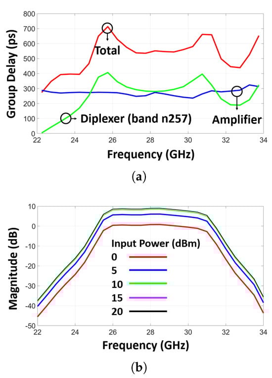 For this simulation, the group delay in Path–1 and power variation in Path–2 are extracted as the amplifier is driven into compression with the frequency sweep from 22 to 34 GHz. The group delay is shown in Figure 17a. As evident from the figure, the peak group delay in Path–1 is about 700 ps when the input power to the amplifier is 0 dBm. Also, the group delay contribution from the standalone amplifier is about 250–300 ps which leads to a 400 ps contribution from the integrated passive component block. This 400 ps group delay is comparable to state–of–the–art filters in industry: TDK ∼250 ps [], Knowles >400 ps [] and >1000 ps []. The RF source power is varied from 0 to 20 dBm with the step size set to 5 dBm. The power variation at the detector port is recorded and it is given by (1):