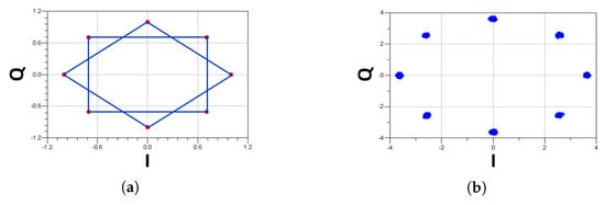 Constellation diagram of /4 DQPSK signal with 3 GHz symbol rate modulated on 28 GHz RF carrier: (a) ideal and (b) distorted.