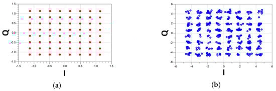 Constellation diagram of 64–QAM signal with 3 GHz symbol rate modulated on 28 GHz RF carrier: (a) ideal and (b) distorted.