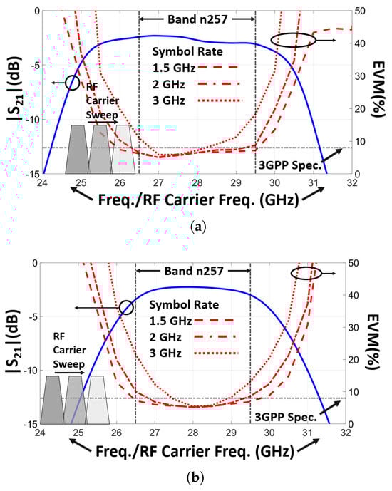 A sweeping RF carrier frequency with a variable symbol rate can give an insight into the effects of various component design parameters on the EVM []. The methodology presented here can be scaled to extract EVM contributions with various modulation sources in conjunction with the performance metrics of mm wave filters, diplexers and other passive components []. To assess the effect of filter characteristics on EVM, we employ the following methodology: