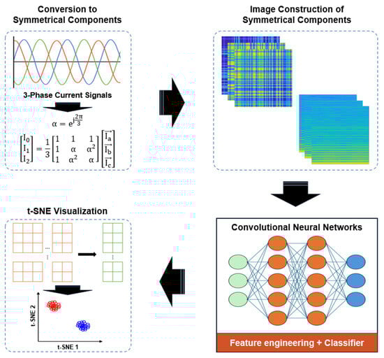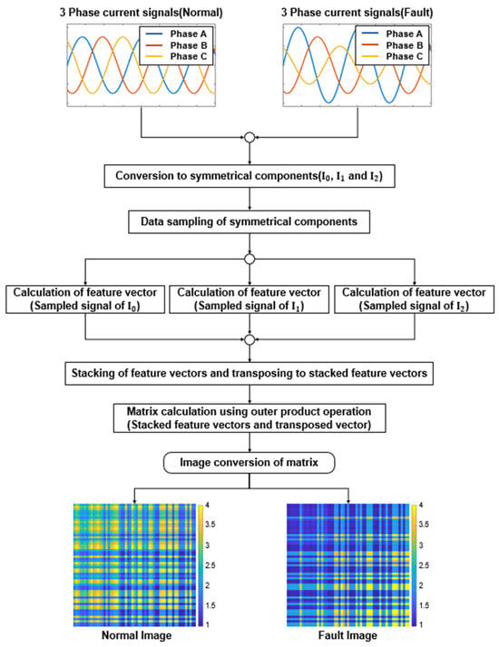 To fully capitalize on the rich information in all three symmetrical components, this study proposes a new image-based technique that integrates information from the zero, positive, and negative sequences simultaneously. Each component’s time-domain features are extracted and combined into a single image such that the differing trends of these components under fault conditions are collectively represented. By converting multi-component current data into an image matrix, we enable the use of powerful image-classification Convolutional Neural Networks (CNN) for fault recognition. We validate this method using an experimental model and compare its performance with a commonly utilized image-based fault diagnosis approach (Short-Time Fourier Transform (STFT) spectrogram analysis). Additionally, we assess practical considerations such as computation cost and noise robustness and discuss the method’s applicability to different motors and operating regimes. Figure 1 provides a flowchart of the overall methodology introduced in this paper, from raw signal acquisition to fault classification. The main contributions of this paper are summarized as follows: