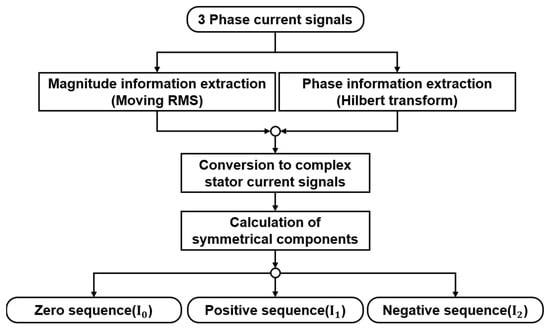 Several prior studies illustrate the efficacy of symmetrical components-based analysis. For example, Xavier et al. [10] transformed three-phase currents into symmetrical components and extracted features from the positive- and negative-sequence components to classify mechanical and electrical faults using various machine learning algorithms. Silvia et al. [11] focused on stator winding faults and found that the negative-sequence component increased with the severity of the fault and load. Camila et al. [12] reported that all three symmetrical components—zero, positive, and negative—increase under both mechanical and electrical fault conditions, highlighting their potential for comprehensive fault detection. Arkadiusz et al. [13] effectively diagnosed faults such as rotor cage asymmetry and static/dynamic eccentricities by monitoring the zero-sequence component.