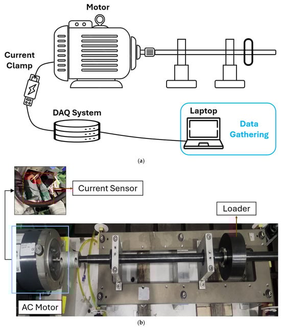 We evaluated the proposed fault diagnosis method on a laboratory test bench designed for inducing various motor faults. The experimental platform is a rotor kit from SpectraQuest, which allows controlled introduction of faults. The setup consists of a three-phase induction motor coupled to a rotor and load via a flexible coupling. The shaft and rotor can be modified to simulate different faults. A schematic diagram of the measurement system is provided in Figure 4a, and a photograph of the actual experimental setup is shown in Figure 4b. In the schematic (Figure 4a), the motor, the shaft with rotor kit, the coupling, and the locations of fault insertion (e.g., weights for unbalance, bending for bowed shaft, etc.) are illustrated. Also indicated are the current sensors clamped on the motor’s three-phase supply lines and the data acquisition system connected to a computer for recording.