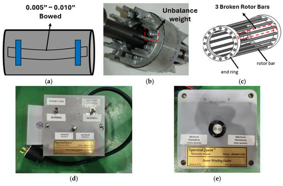 Simulating faults in the experimental model. (a) Bowed shaft. (b) Unbalance. (c) Broken rotor bar. (d) Single phasing and voltage unbalance. (e) Stator winding fault.