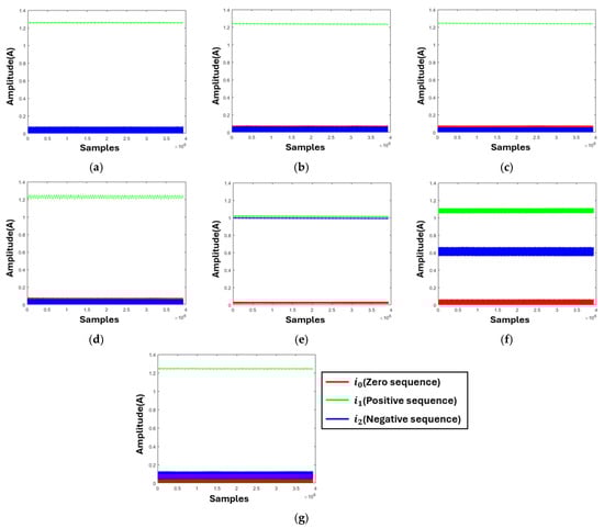 Before proceeding to image construction and CNN classification, we first verify that the induced faults indeed produce distinguishable signatures in the symmetrical component domain. The acquired current signals for each condition were transformed into , , and sequences (using the method of Section 2.1). Figure 6 illustrates example time-waveforms of the symmetrical components for each of the seven conditions. In each sub-figure, the evolution of , , and over time is shown (after the initial transients have settled). From visual inspection of Figure 6, we observe that each fault yields a qualitatively different pattern in the symmetrical components.