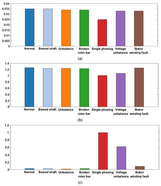 To quantify these observations, Figure 7 presents the RMS values of each symmetrical component for all samples in each condition, and Table 5 lists the numerical values of these RMS currents (normalized to the motor’s rated current). For the normal condition, the positive-sequence component had the highest RMS (1.26 per unit, essentially the motor’s fundamental current), while and were negligible. In contrast, in the single phasing fault, the negative-sequence component’s RMS became very large (about 1.00 per unit, comparable to the positive-sequence), and for voltage unbalance, it was also significant (0.62 per unit). Each fault condition exhibits a unique combination of , , and magnitudes. These differences confirm that all three components respond differently under various motor fault states, reinforcing the need to consider them together. In practical terms, one could use thresholds on these RMS values to detect some faults (indeed, traditional relay protection uses negative-sequence overcurrent to detect unbalance), but our approach goes further by using the full waveforms and a wide array of features, not just RMS.