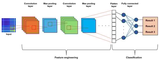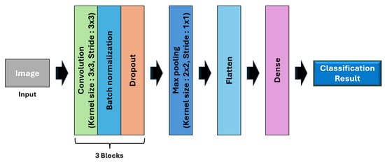 For the classification of the feature-vector images, we implemented a CNN. CNNs are well-suited for image recognition tasks as they automatically learn spatial hierarchies of features through convolutional layers [20,21,22,23]. Our CNN model is designed to be relatively compact, given the small image size () and the structured nature of the images. Figure 8 shows an example of a generic CNN architecture [24], and Figure 9 illustrates the specific architecture used in this study.