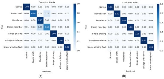 Figure 10 shows the confusion matrices for both methods: (a) STFT-based and (b) proposed method. In the confusion matrix for STFT (Figure 10a), we can see that most classes are correctly identified, but there are errors particularly between the bowed shaft and broken rotor bar classes (the matrix shows some percentage of bowed shaft instances being classified as broken bar or vice versa). This confusion is understandable because both are mechanical faults that, in the frequency domain, might have somewhat similar low-frequency signatures (e.g., both can produce sidebands around 1X running frequency). In contrast, the confusion matrix for the proposed method (Figure 10b) is almost entirely diagonal with 100% in every cell except one, indicating near-perfect separation of all seven conditions.