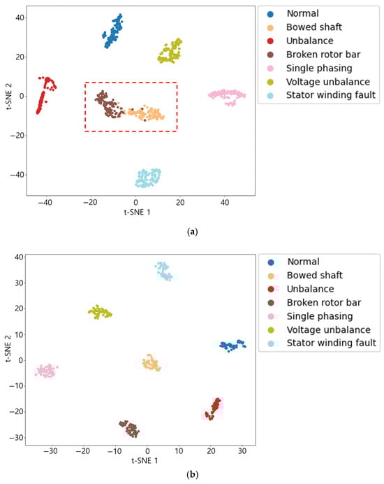 To further understand how the CNN differentiates the faults, we examined the feature embeddings of the last layer before classification via t-SNE visualization. Figure 11 shows the t-SNE plot of the learned feature space for (a) the STFT model and (b) the proposed model. In Figure 11a (STFT), we can see clusters corresponding to each fault type, but there is some overlap; particularly, the bowed shaft and broken rotor bar clusters are touching or intermingled (highlighted by a red dashed rectangular). This aligns with the confusion matrix, finding that those two were sometimes confused by the STFT approach. In contrast, Figure 11b (proposed) shows well-separated clusters for every fault class; each colored group of points (each color is one fault type) is distinctly apart from the others. This indicates that the CNN with the feature images has found a representation where each fault is linearly separable with clear margins. The improved separability likely arises because the feature images encapsulate fault information in a more linearly separable way than raw spectrogram pixel intensities.
