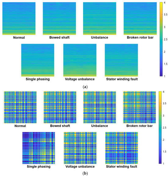 Sample comparison of visual patterns from the two methods for all seven conditions. (a) STFT-based spectrogram image. (b) Proposed symmetrical components feature image.