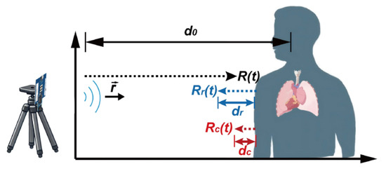 HR and RR can be obtained through the acquisition of vibration data caused by the respiration and heartbeat of the human body in the chest cavity. The chest cavity vibration is assumed as sinusoidal functions of time. As shown in Figure 1, the distance between the UWB radar and the human chest can be expressed as: