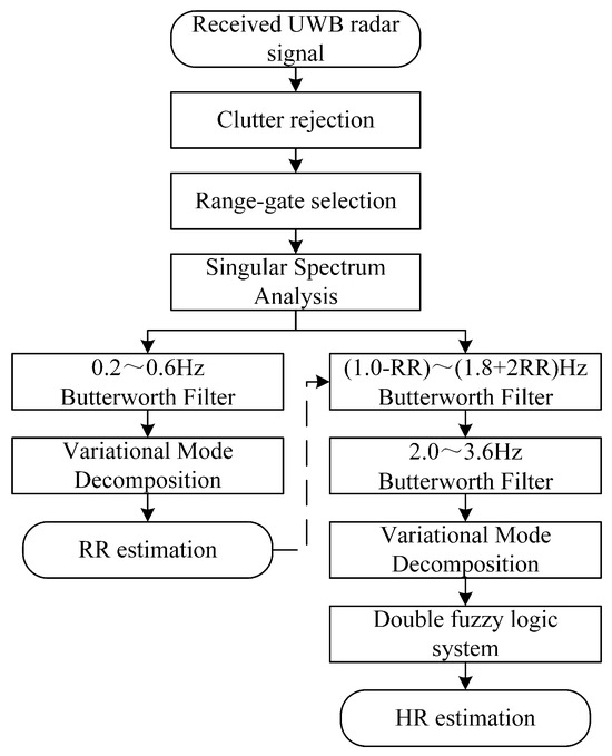 Ultra-wide-band (UWB) radar technology is a contactless signal detection technology. The UWB technology can be used for the clinical medical monitoring of the human heartbeat and respiration. In this paper, a novel algorithm is proposed to estimate heart rate (HR) and respiratory rate (RR) depending on the received UWB radar signal. The proposed algorithm initially applies Singular Spectrum Analysis (SSA) to remove noise from the received UWB radar signal, and then applies Variational Mode Decomposition (VMD) to effectively separate the respiratory and heartbeat components. To address the issue of heartbeat components being susceptible to harmonic and inter-modulation components interference, a double fuzzy logic estimation is implemented to achieve robust real-time extraction of heart rate. In this paper, extensive experiments are conducted at various distances and angles. The experimental results of the SSA-VMD-Double-Fuzzy-Logic (SVDF) method have been compared with other methods, demonstrating its effectiveness and the advantages of the SVDF proposed in this paper.