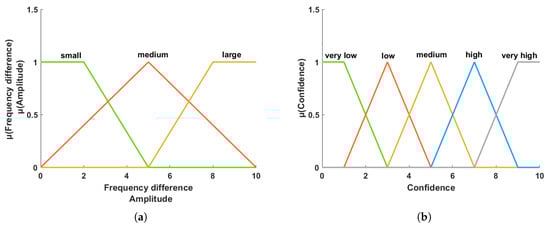 Firstly, the IMFs close to the heart rate frequency are selected as the pre-selected IMFs corresponding to HR. The frequencies of these pre-selected IMFs have a relationship with the theoretical inter-modulation components. The frequency difference between the pre-selected IMFs and their corresponding theoretical intermodulation components, as well as the frequency amplitude of these intermodulation components, are then calculated. These values are used as inputs to the fuzzy logic reasoning system. The calculated results are served as inputs to the first FLS [21,26]. In the first FLS, the frequency difference and frequency amplitude are divided into three fuzzy sets (large, medium, small). The membership functions for the frequency difference and frequency amplitude are shown in Figure 3a. An “if-then” rule is designed to determine the confidence level of each candidate IMF based on these fuzzy sets of frequency difference and amplitude. Completed defuzzification of each candidate IMF is achieved through the Centroid Method, a confidence value is calculated, whose membership function is illustrated in Figure 3b. All FLS rules are shown in Table 1. The sum of the confidence values for all pre-selected IMFs is calculated finally.