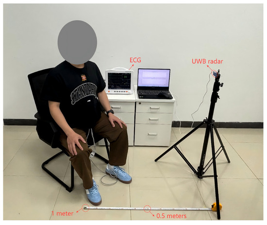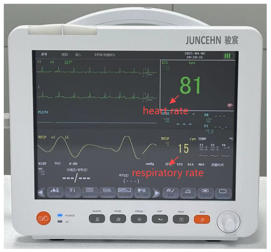 To verify the accuracy of the radar measurement results, a clinical-grade electrocardiograph (ECG) was employed as the reference standard for synchronous recording of both respiratory rate (RR) and heart rate (HR) (Figure 5). By comparing the reference data with the data obtained from the UWB radar, the performance of the radar and the accuracy of the algorithm are evaluated.