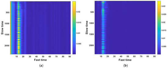 The received UWB radar signals contain reflection signals from both the target and the background. The background reflection signals are referred to as background clutter, which typically have a large amplitude compared to respiration and heartbeat. The background clutter remains stable in the slow-time dimension. The interference from background clutter can be effectively reduced by subtracting the average of all received pulses within the slow time from each pulse, as shown in Formula (8):