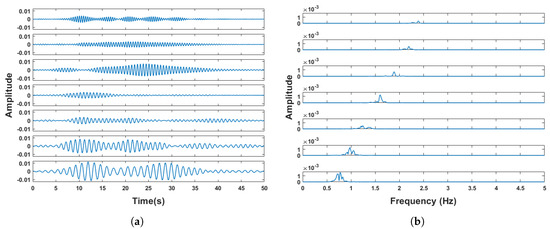 Candidate respiratory IMFs after VMD. (a) Time-domain spectrum. (b) Frequency-domain spectrum.