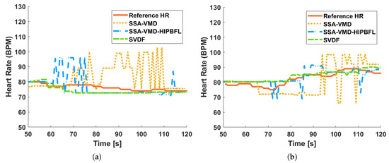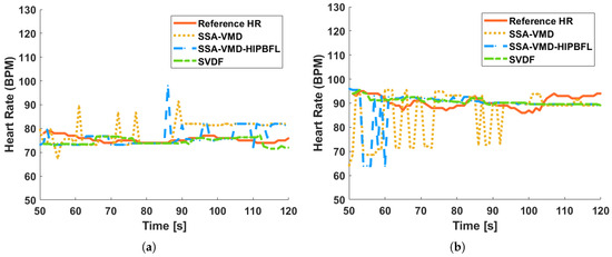 As demonstrated in Figure 15b, the SVDF algorithm exhibits superior tracking capability for heart rate variations. During the initial data collection period from 50 to 80 s, the participant maintained relatively stable heart rates. Subsequently, during the interval between 80 and 120 s, the proposed algorithm accurately captured a significant sustained increase in heart rate. These findings provide compelling evidence for the robust dynamic heart rate monitoring performance of the SVDF algorithm.