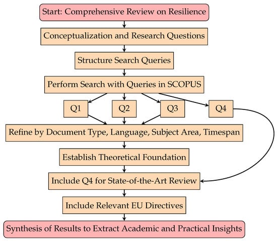 The initial three search queries (Q1–Q3) were employed to establish the theoretical foundation of resilience by identifying relevant literature on resilience, infrastructure, and related state-of-the-art methods and measures. The results of these queries offered a thorough understanding of the existing knowledge and theoretical frameworks related to resilience. Subsequently, the fourth search query (Q4) was employed to collect articles for the state-of-the-art review, in addition to documents relevant to European Union directives on critical infrastructure resilience, protection, and cybersecurity [19,20,21,22,23,24]. This approach ensured that the review incorporated not only the academic and theoretical perspectives but also practical and regulatory insights from the EU’s regulatory framework.