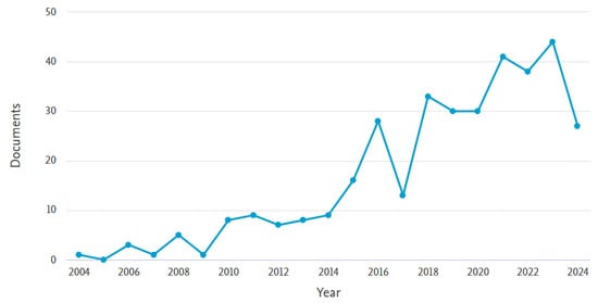 Documents published per year. The figure illustrates the yearly trend in cyber–physical resilience publications, showing a steady increase in research activity since 2004, with a significant rise in recent years. The search was conducted on 13 August 2024, so the document count in 2024 could increase.