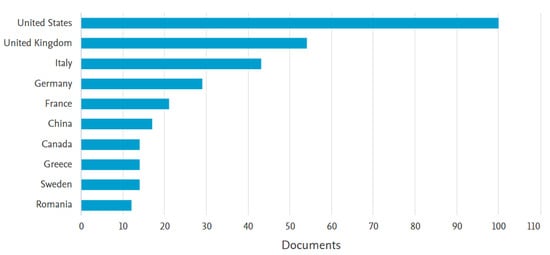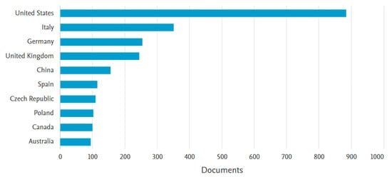 Figure 4 displays the geographical distribution of research on cyber–physical critical infrastructure resilience based on the fourth search query. The data indicates that the topic is of significant importance in the United States and the United Kingdom, followed by Italy and Germany, with China also contributing notably. However, when analyzing the results from the second search query, Figure 5, which focuses on critical infrastructure protection without accounting for the cyber–physical aspects, a different trend emerges. Despite the USA leading in the overall number of studies, Italy and Germany have individually published more articles, suggesting a potential gap in addressing the cyber–physical nature of emerging threats to critical infrastructures. Furthermore, when considering the entire European Union as a single entity, the ranking shifts, revealing that the EU has the highest volume of research in this domain, followed by the USA and the UK.