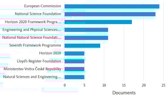 The bar chart in Figure 6 shows the top funding organizations contributing to the documents analyzed, with the European Commission and the National Science Foundation being the most significant contributors, each supporting over 20 documents.