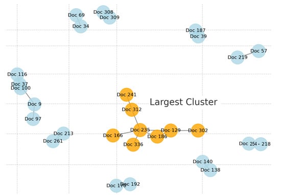 Cosine similarity is used to create clusters based on how often documents were co-cited. Then, a co-citation network was built. The clusters were identified using connected components, grouping documents that were strongly linked, resulting in 10 distinct clusters. For naming the clusters, we applied the TF-IDF algorithm [25,26] to the document titles and keywords within each cluster, extracting the top three keywords to summarize the main themes. These keywords were used to generate descriptive names that reflected the content of the documents in each cluster. The constructed co-citation clusters in Figure 7 represent groups of works that are conceptually related, as they are often cited together by subsequent research.