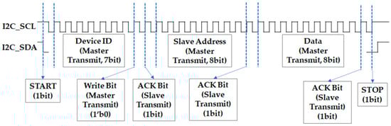 The master’s role is to transmit data to the slave using the SDA line. It sends a 7-bit master device identification (ID) field, an 8-bit slave address field, and a 1-bit Write/Read command field. During a Write operation, the master transmits an 8-bit data field to the slave. During a Read operation, the master sends a 1-bit negative acknowledgment (NACK) field to the slave as a response to the received data. If the data are received correctly, the NACK field is set to <1′b1>; otherwise, it is set to <1′b0>.