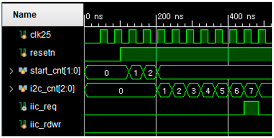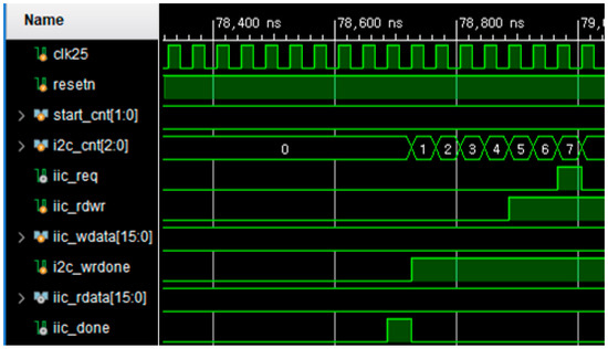 - When <start_cnt> is incremented and reaches <start_cnt == 2>, <i2c_cnt> begins to increase. When <i2c_cnt == 4>, <i2c_rdwr = 0> (Write) and <iic_wdata = 8′hff> are input.