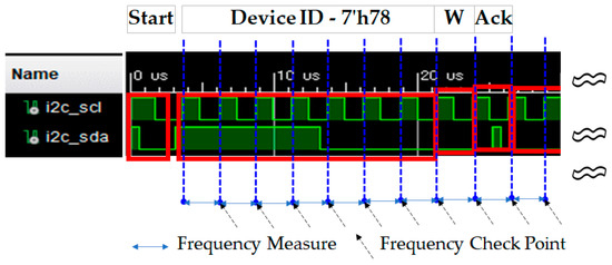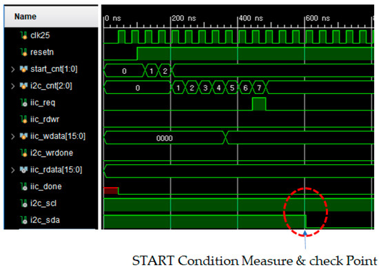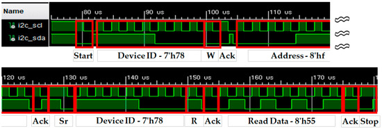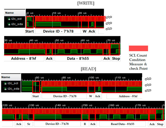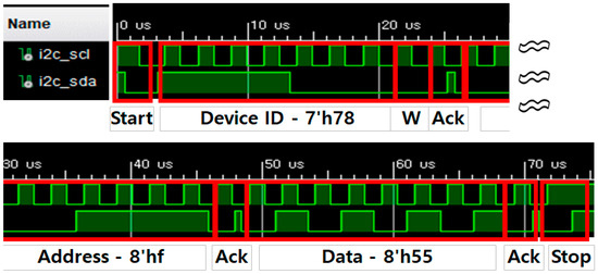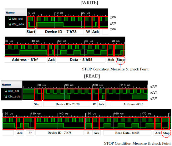 Figure 8 presents the complete waveform of the SCL and SDA signals for the I2C Write operation, while Figure 9 shows the complete waveform of the SCL and SDA signals for the I2C Read operation.